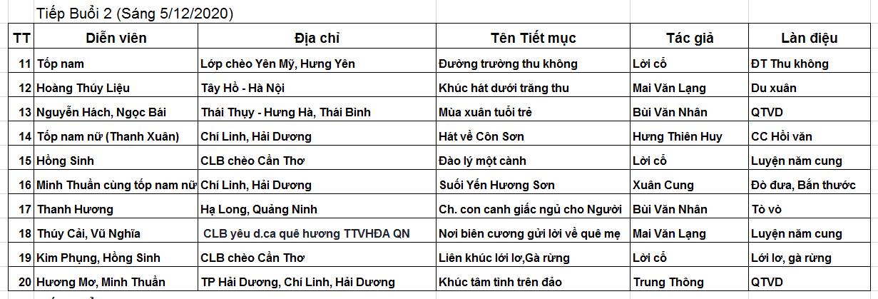 | TT | Diễn viên | Địa chỉ | Tên Tiết mục | Tác giả | Làn điệu | |||